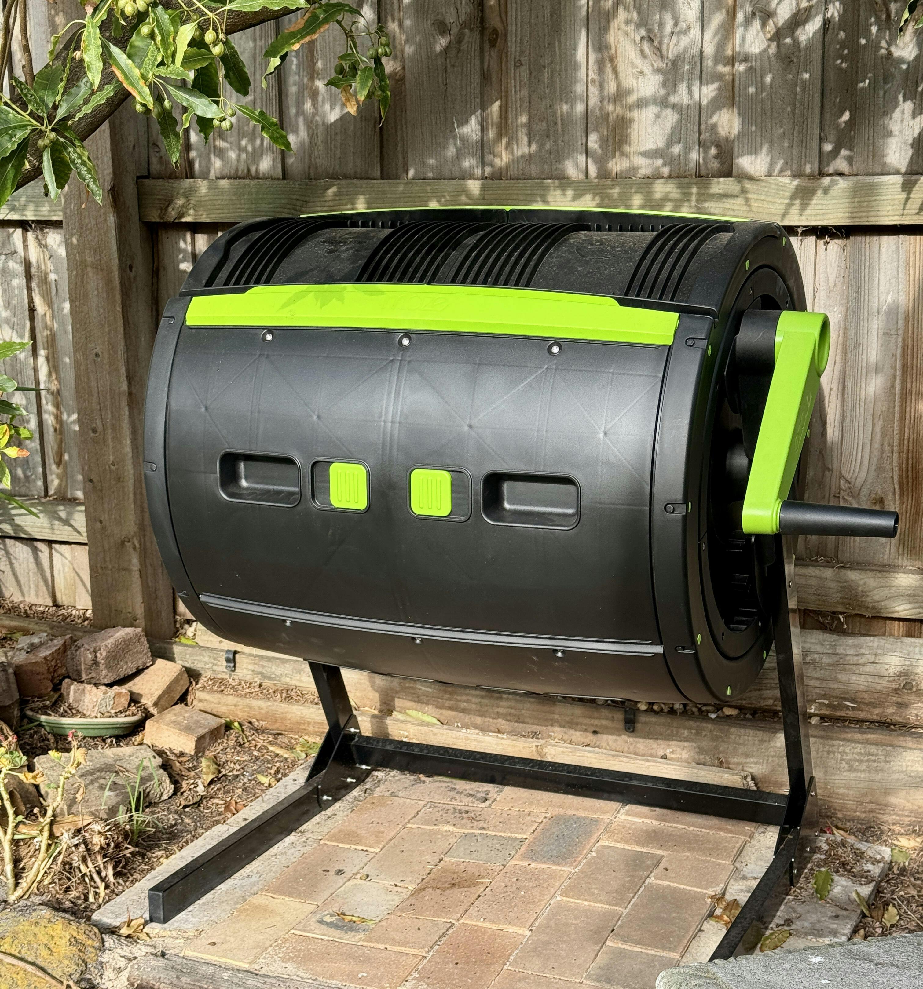 A key feature is the two compartments which means you never stop composting. When the first compartment is full, you start on the second compartment.